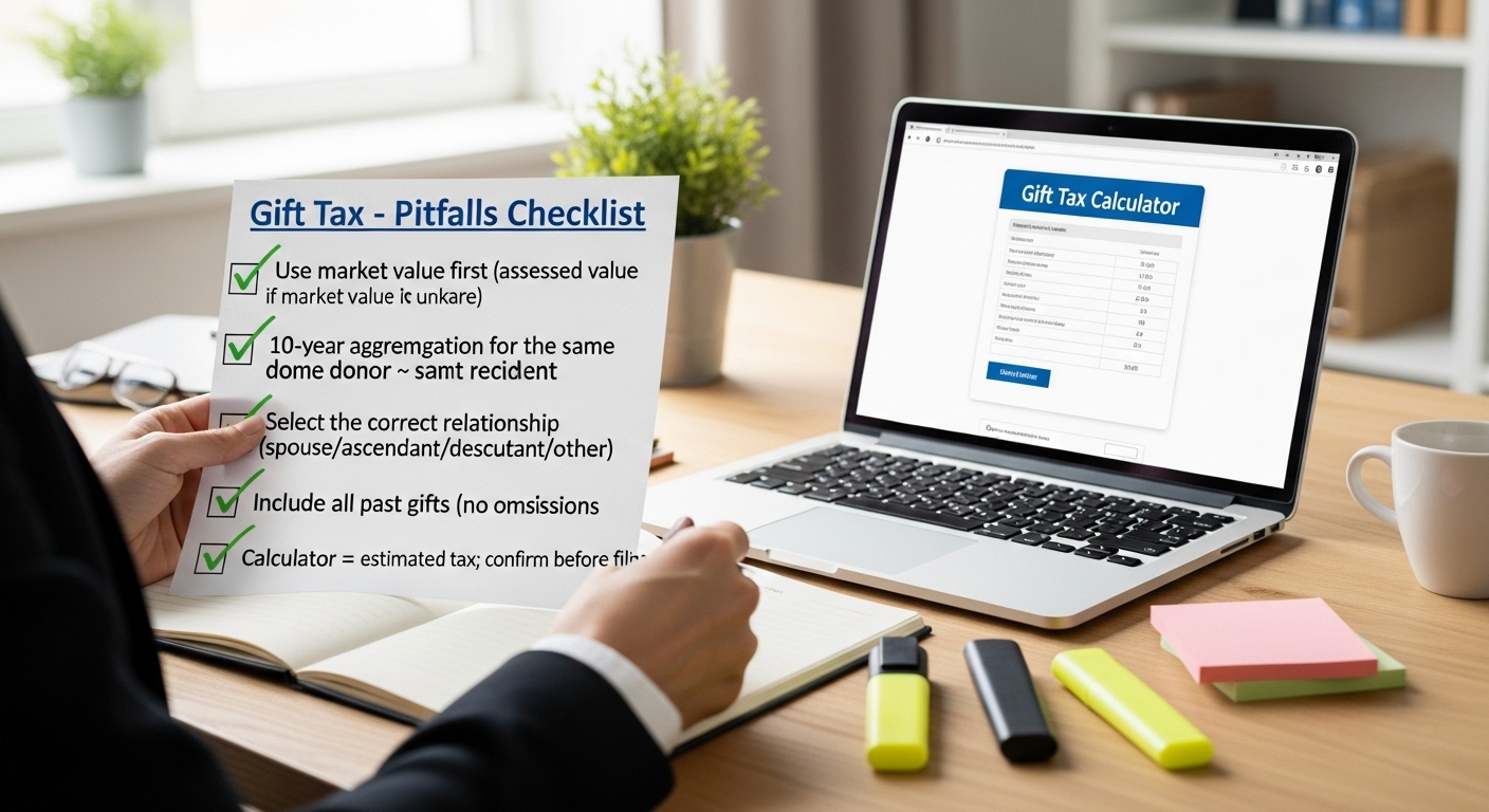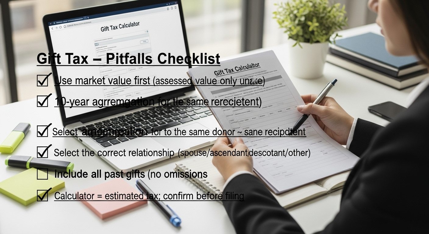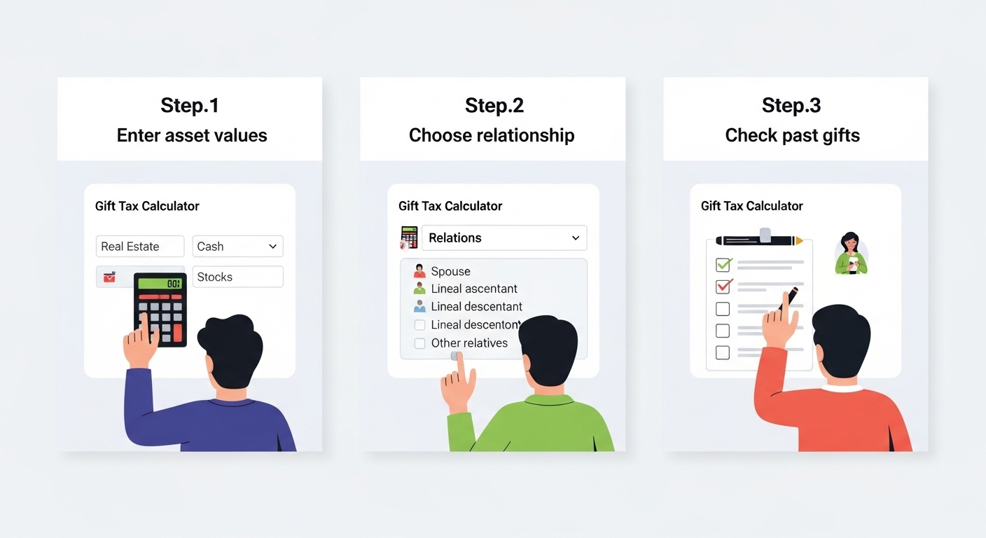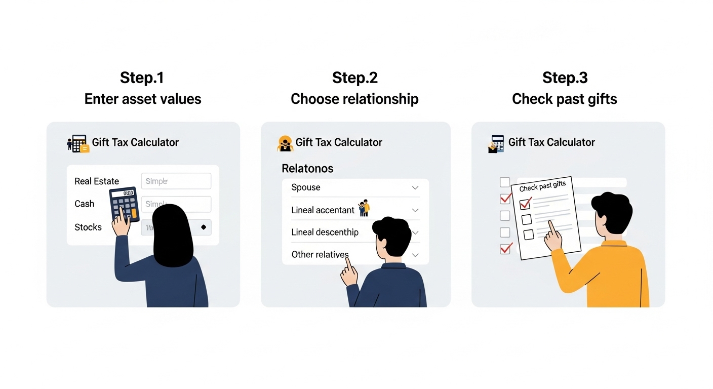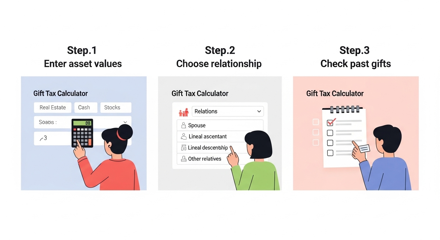 홈택스 등에서 제공하는 계산기는 증여재산가액, 증여자-수증자 관계, 최근 10년 내 동일인 증여내역을 입력하면 과세표준·세율·예상 세액을 자동 계산합니다. 결과 화면은 저장·인쇄하여 신고 시 참고할 수 있습니다.