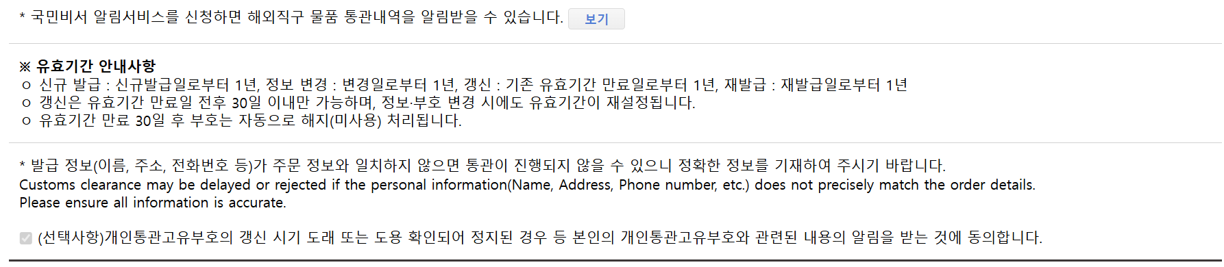 앞으로는 유효기간 1년 갱신제가 도입되기 때문에, 해외직구를 자주 이용한다면 미리 발급해 두고 만료 시기에 맞춰 갱신해 두면 갑작스런 통관 지연을 예방할 수 있습니다.