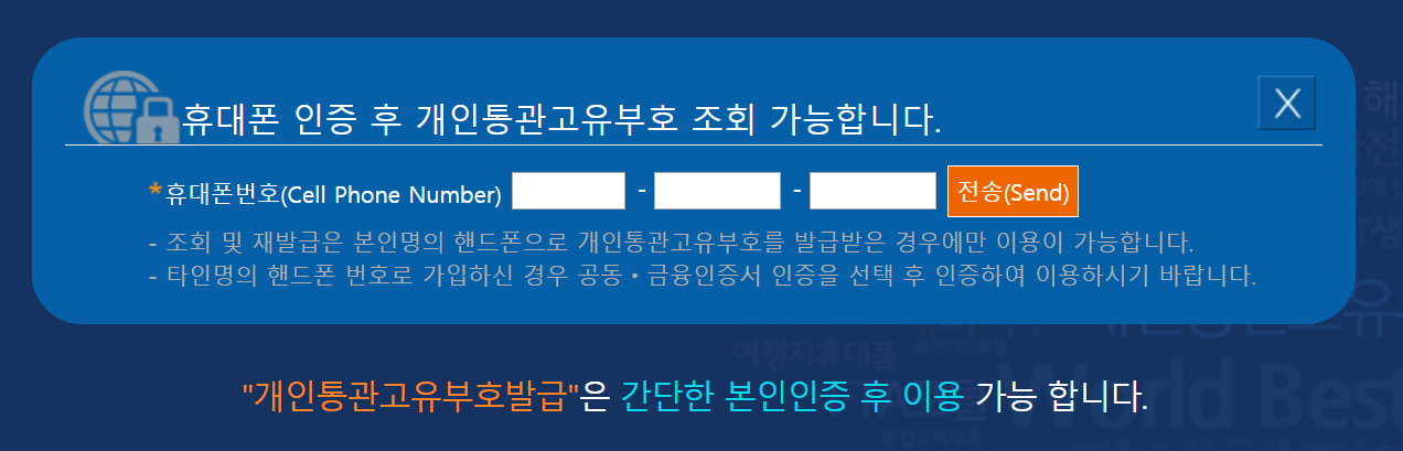 | 본부세관 방문 신청 | 당일 발급 | 본인 명의 휴대폰·인증서가 없을 때 이용, 신분증 지참 필수 |
