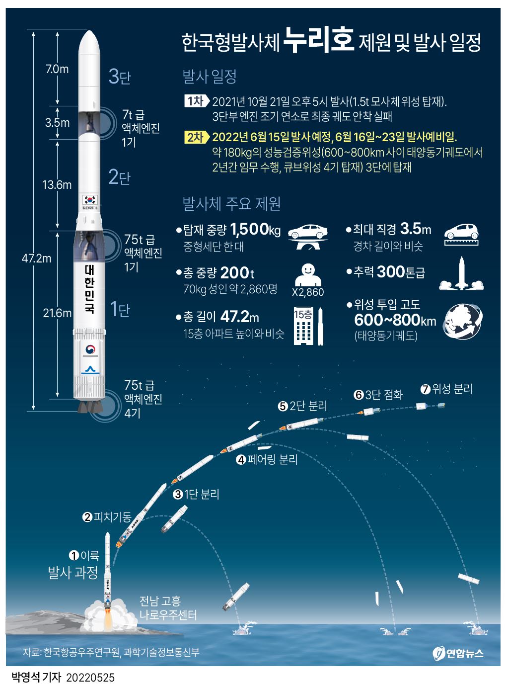1호 발사에서 발견된 3단 엔진 연소 부족 문제를 개선하여 안정적으로 목표 궤도에 진입했습니다. 더미 위성을 정상적으로 분리해 ‘한국이 독자 기술로 실용급 위성을 우주에 보낼 수 있는 나라’임을 증명했습니다.