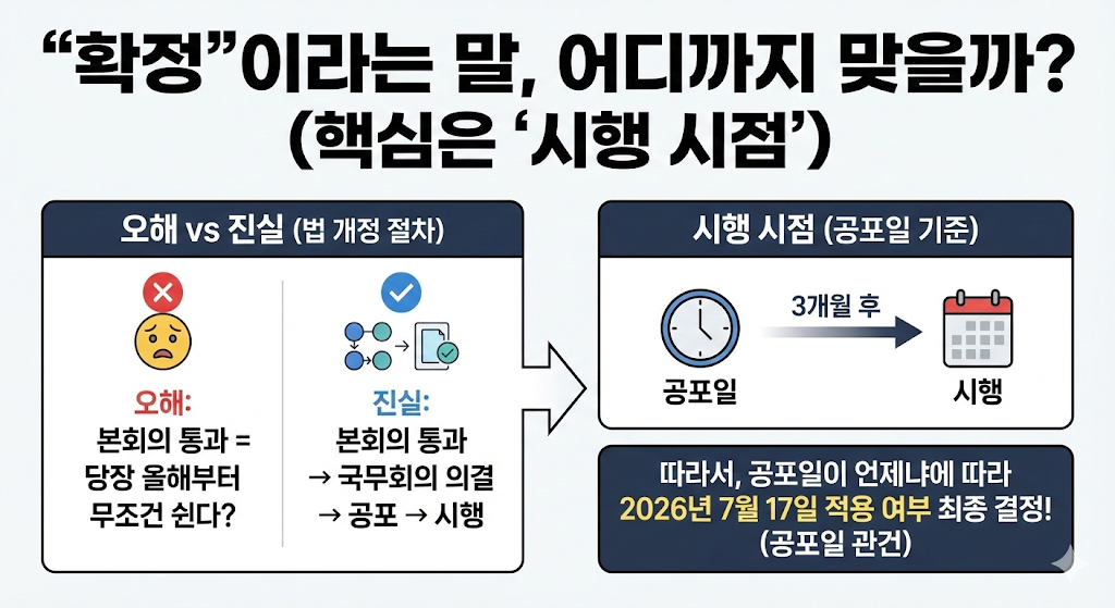 A. 본회의 통과로 방향은 확실해졌지만, 보도된 시행 구조는 공포 후 3개월입니다. 그래서 ‘2026년 7월 17일에 적용되느냐’는 공포일을 확인해야 최종 확정됩니다. :contentReference[oaicite:3]{index=3}