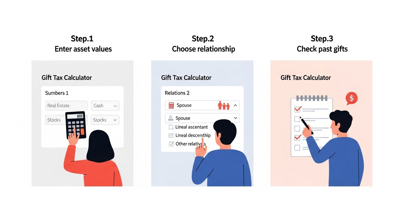 홈택스 등에서 제공하는 계산기는 증여재산가액, 증여자-수증자 관계, 최근 10년 내 동일인 증여내역을 입력하면 과세표준·세율·예상 세액을 자동 계산합니다. 결과 화면은 저장·인쇄하여 신고 시 참고할 수 있습니다.