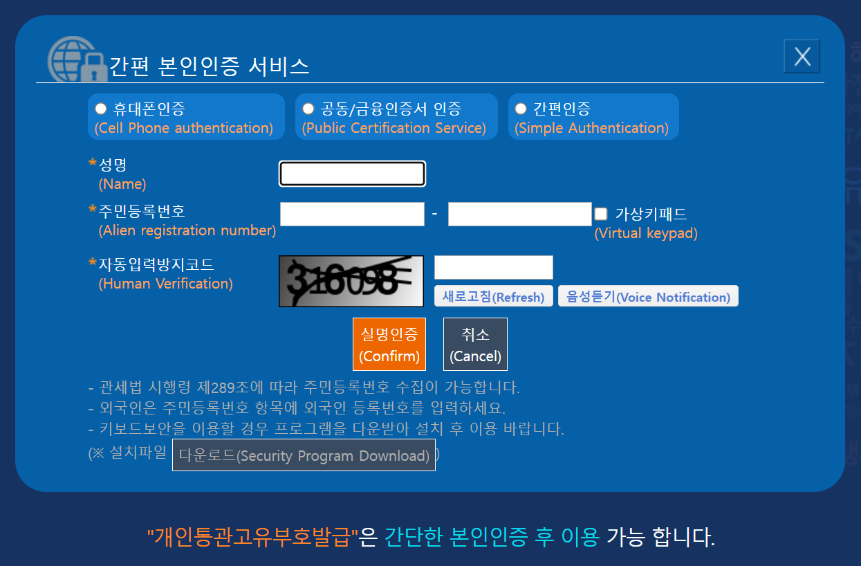 | 본부세관 방문 신청 | 당일 발급 | 본인 명의 휴대폰·인증서가 없을 때 이용, 신분증 지참 필수 |